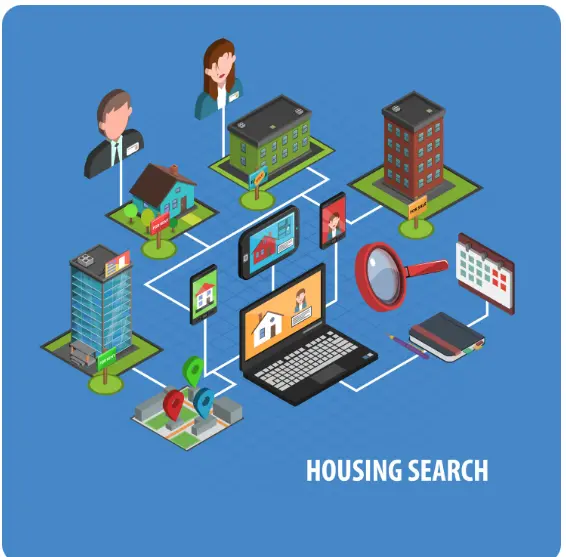 - Property listing with images, location, and pricing